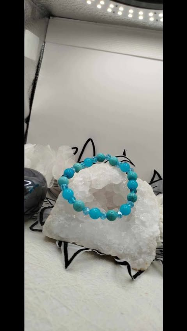 Laissez-vous séduire par ce bracelet élégant qui associe la beauté apaisante de la turquoise, l'énergie positive de la tianhe (amazonite) et l'éclat raffiné des cristaux Swarovski.