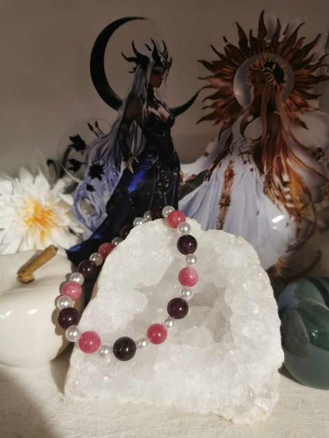 Découvrez l'alliance vibrante du grenat et de la rhodochrosite, rehaussée par la modernité des perles blanches en acrylique :