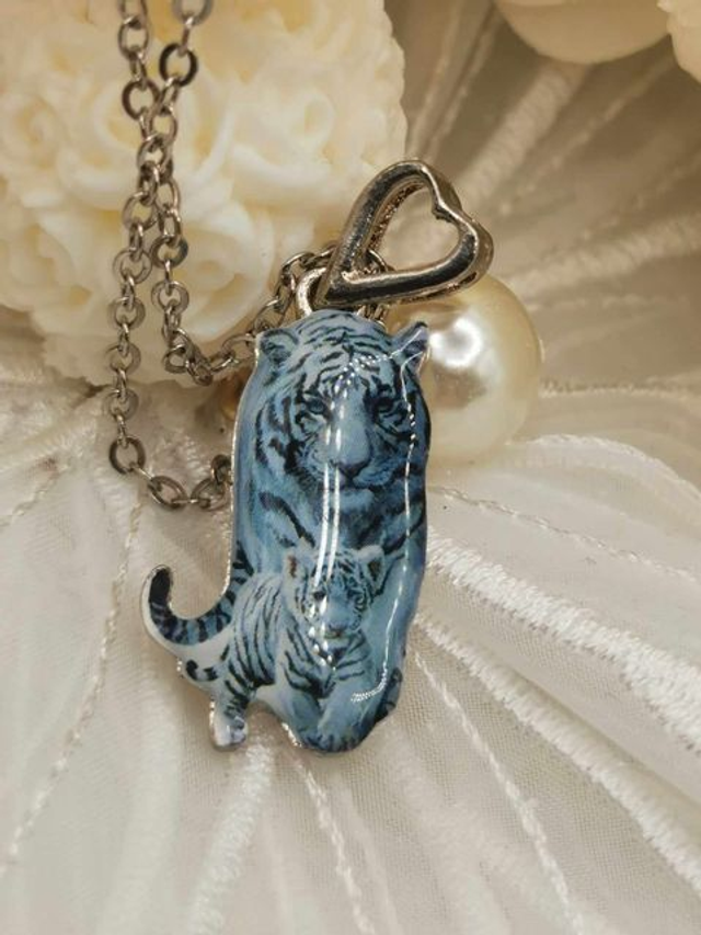 Pendentif représentant un tigre et son petit, symbole de protection et de force, suspendu à une chaîne en alliage avec un charm en forme de cœur. Un bijou tendre et significatif, parfait pour exprimer votre lien familial ou votre amour de la nature.